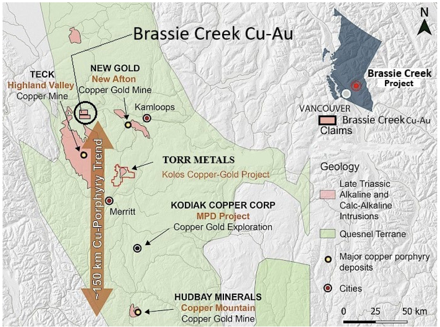 The Brassie Creek Project is a porphyry-skarn copper and gold property located in Southern British Columbia (Figure 1), covering an area of approximately 1,861 hectares and located approximately 50 km west of Kamloops.