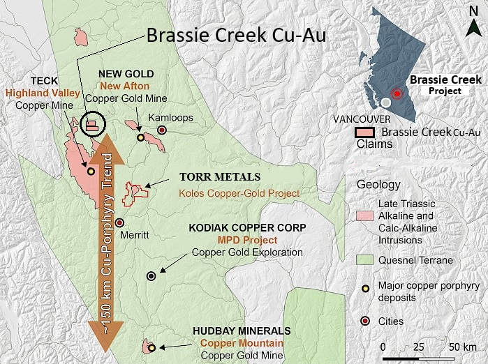 The Brassie Creek Project is a porphyry-skarn copper and gold property located in Southern British Columbia (Figure 1), covering an area of approximately 1,861 hectares and located approximately 50 km west of Kamloops.